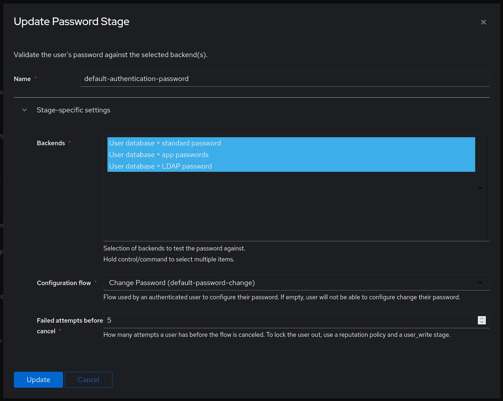 Finally, confirm that the User database + LDAP password backend is selected in Flows and Stages > Stages > Password Stage.